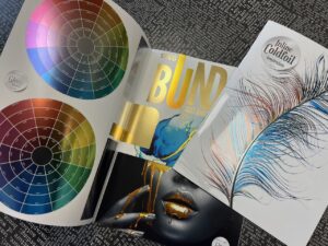 Op de eerste druktoren wordt de lijmlaag / kleeflaag gedrukt daar waar de folie moet komen. Bij de tweede druktoren hecht de folie zich haarscherp aan de kleeflaag, in spot als een 5de kleur in jouw opmaak. Zo krijg je zilver-goud-… in fijne details.